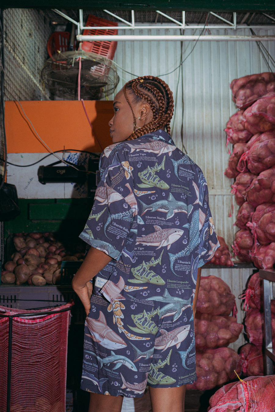 Camisa Joyas 2 – Tiburón Ballena en rayón de caída suave y tacto fresco. Estampado marino en tonos azules inspirado en el tiburón ballena: vibrante, versátil y perfecto para clima cálido. Silueta relajada tipo “resort” para usar abierta o cerrada.